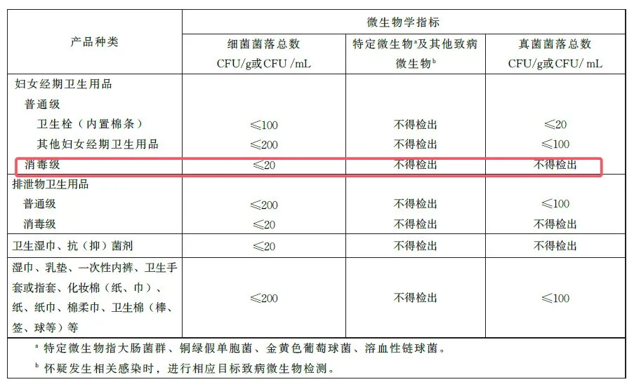 根據(jù)GB 15979—2024《一次性使用衛(wèi)生用品衛(wèi)生要求》,衛(wèi)生巾分為普通級和消毒級兩種。普通級衛(wèi)生巾的細菌菌落總數(shù)≤200CFU/g,真菌菌落總數(shù)≤100CFU/g,而消毒級衛(wèi)生巾的細菌菌落總數(shù)≤20CFU/g,真菌菌落不得檢出。