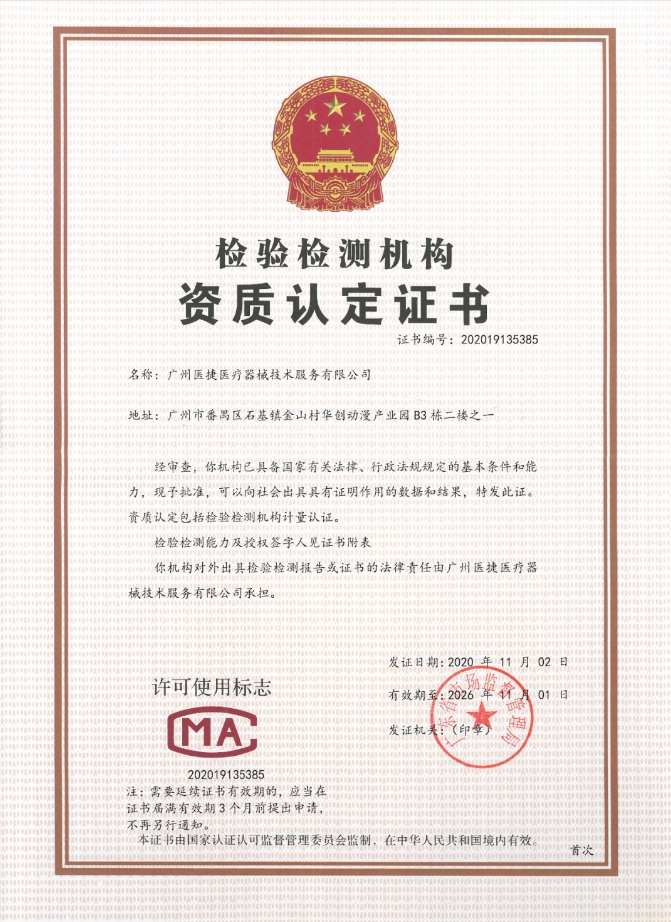 廣州醫(yī)捷實(shí)驗(yàn)室順利通過中國計(jì)量認(rèn)證(CMA)評(píng)審并獲得認(rèn)可資質(zhì),可為醫(yī)療器械企業(yè)提供專業(yè)的檢測(cè)服務(wù)。